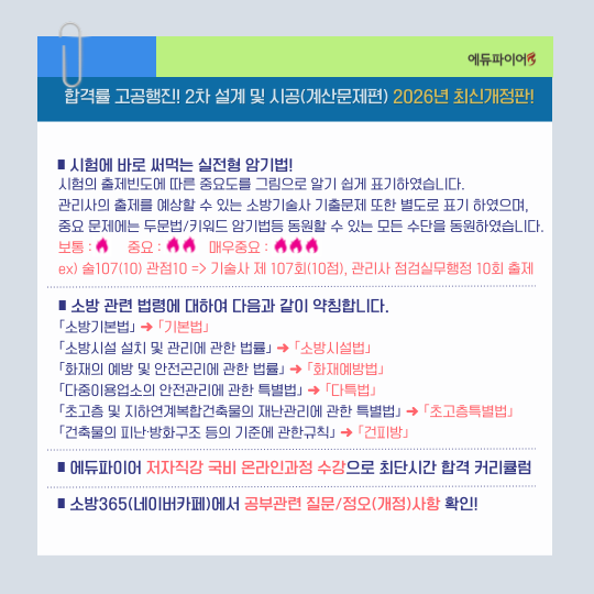 | 목차 | ▣ 목차 [수험서의 특징] [必勝! 수험생에게 필요한 사항들] [소방시설관리사 취득 방법] [각종 단위 등 참고사항] [소방시설관리사 기출문제 및 경향 분석] [계산문제 출제 문제 요약]